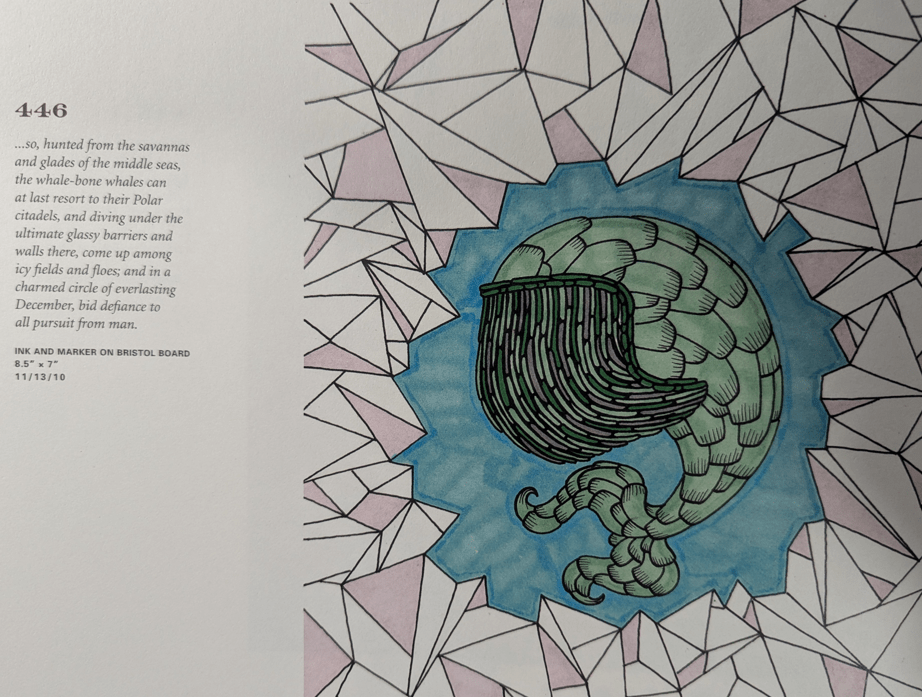 I’ve been a fan of Matt’s art and his approach to it since we got back in touch many years after college, so I had seen a fair amount of his Moby-Dick pieces online and in person before I finally got a copy of Moby-Dick in Pictures. I was still floored by seeing the whole project as it was intended, and I knew I wanted to read it thoroughly and not flip through it like a coffee table art book.